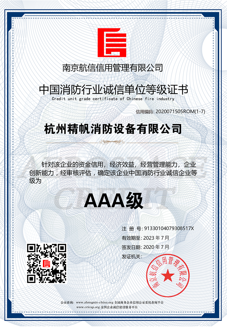 中國(guó)消防行業(yè)誠(chéng)信單位等級(jí)證書